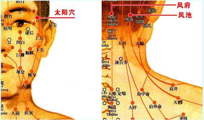 贴于太阳穴、风池穴、风府穴(脸侧和后脖子处)